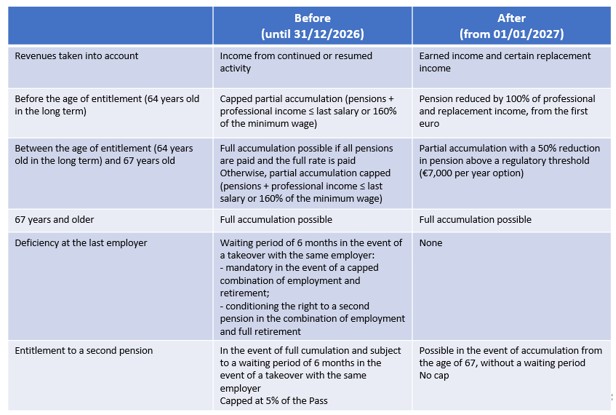 - Between the legal retirement age and 67 years old: Partial accumulation with a pension cap of 50% of the income from employment above a threshold set by decree (threshold of 7000 euros mentioned).