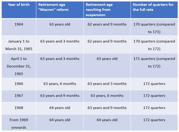 The suspension of the application of this age measure until 1 January 2028 has the effect of shifting the 64-year-old threshold to the generations born from 1969 onwards, instead of 1968 as provided for in the 2023 reform.